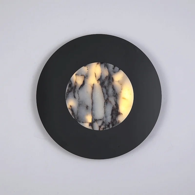 Con 30 cm de diámetro, destaca sin abrumar. El anillo de acero negro enmarca la piedra como si fuera una obra de arte, mientras que el LED integrado en la parte trasera emite la luz suficiente para dar vida al alabastro. Se trata de una iluminación de acento para estancias que ya cuentan con fuentes de luz funcionales, ya que añade calidez, textura y un punto focal.