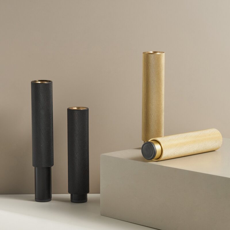 STEN transforme les meubles grâce à ses pieds en laiton massif qui confèrent un caractère industriel aux armoires, buffets et canapés. Le corps cylindrique est recouvert d'un motif diamanté, tandis qu'une bande en laiton lisse sur le dessus apporte une touche raffinée et un détail de montage.