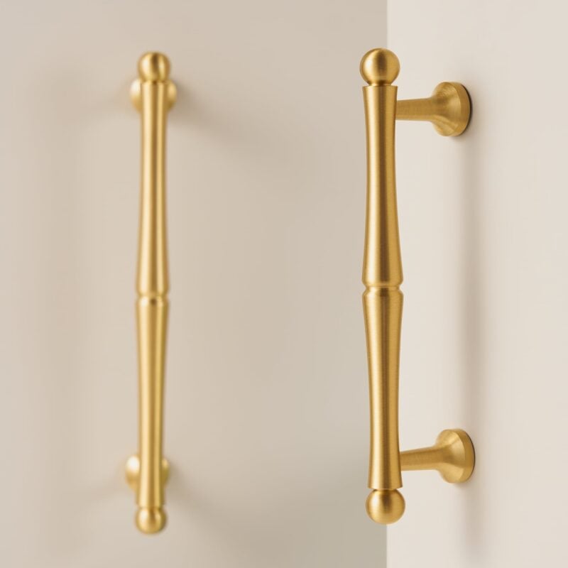 De handgreep is vervaardigd uit massief messing, waarbij de gedraaide delen op een draaibank zijn gevormd voor een nauwkeurige symmetrie. Verkrijgbaar in satijnmessing voor een warme uitstraling of satijnnikkel voor een koelere, meer eigentijdse uitstraling. Beide afwerkingen zijn verzegeld om hun uiterlijk te behouden, terwijl bij ongelakte versies een natuurlijke patina kan ontstaan bij langdurig gebruik.
