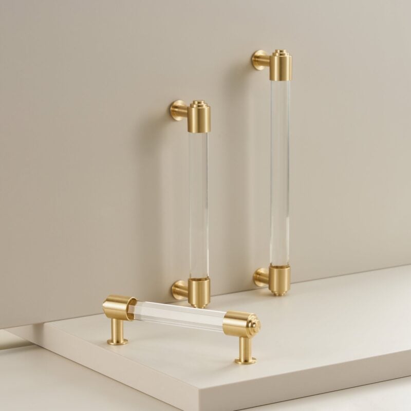 Clear acrylic pairs with solid brass, combining material clarity with refined metalwork. The acrylic catches light; the brass provides weight. The solid brass construction ensures lasting durability, with each piece cast and finished to exacting standards.